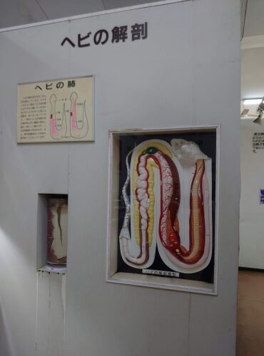 説明の写真や図表は色がセピア色に褪せてしまっているものがまだ貼ってあります。40数年前に来た時も同じものが貼ってあったのでしょうか。歴史の古い学校の理科室に置いてあるような年期物の模型などもあります。ヘビの標本はホルマリンが茶色に濁っていたり、量が少なくなって標本が露出してしまったりと、こちらもおどろおどろしい感じを倍増させています。